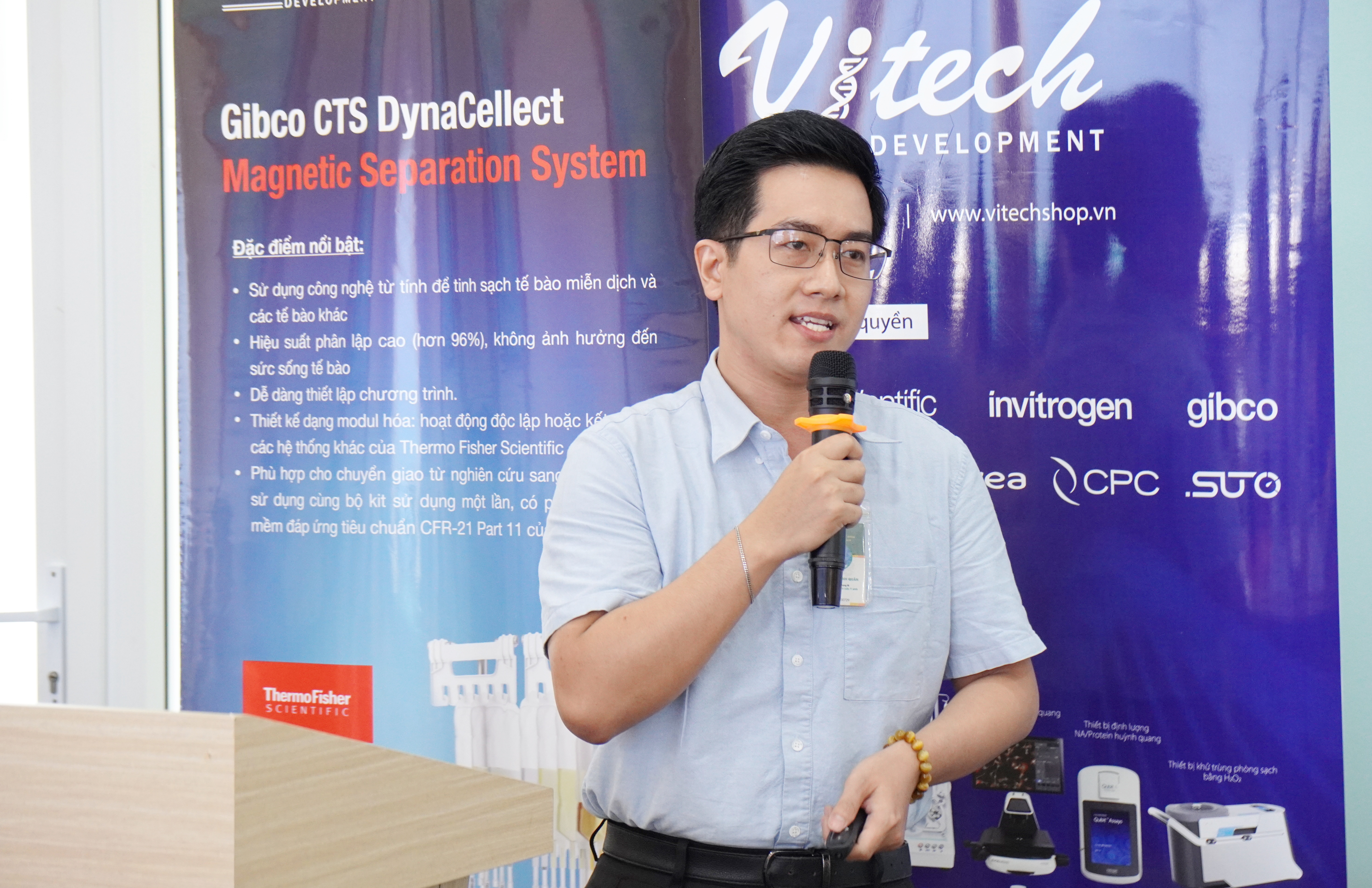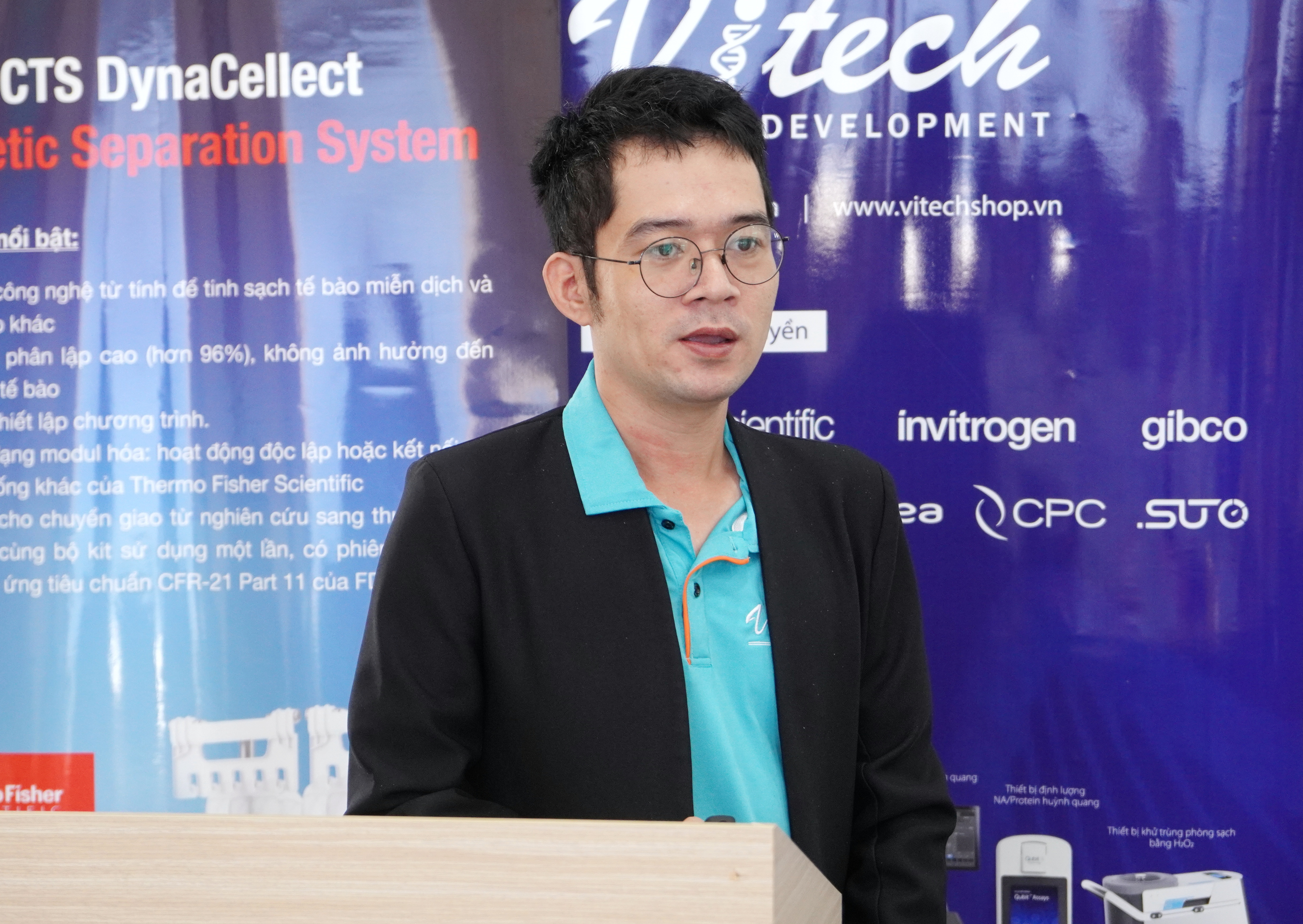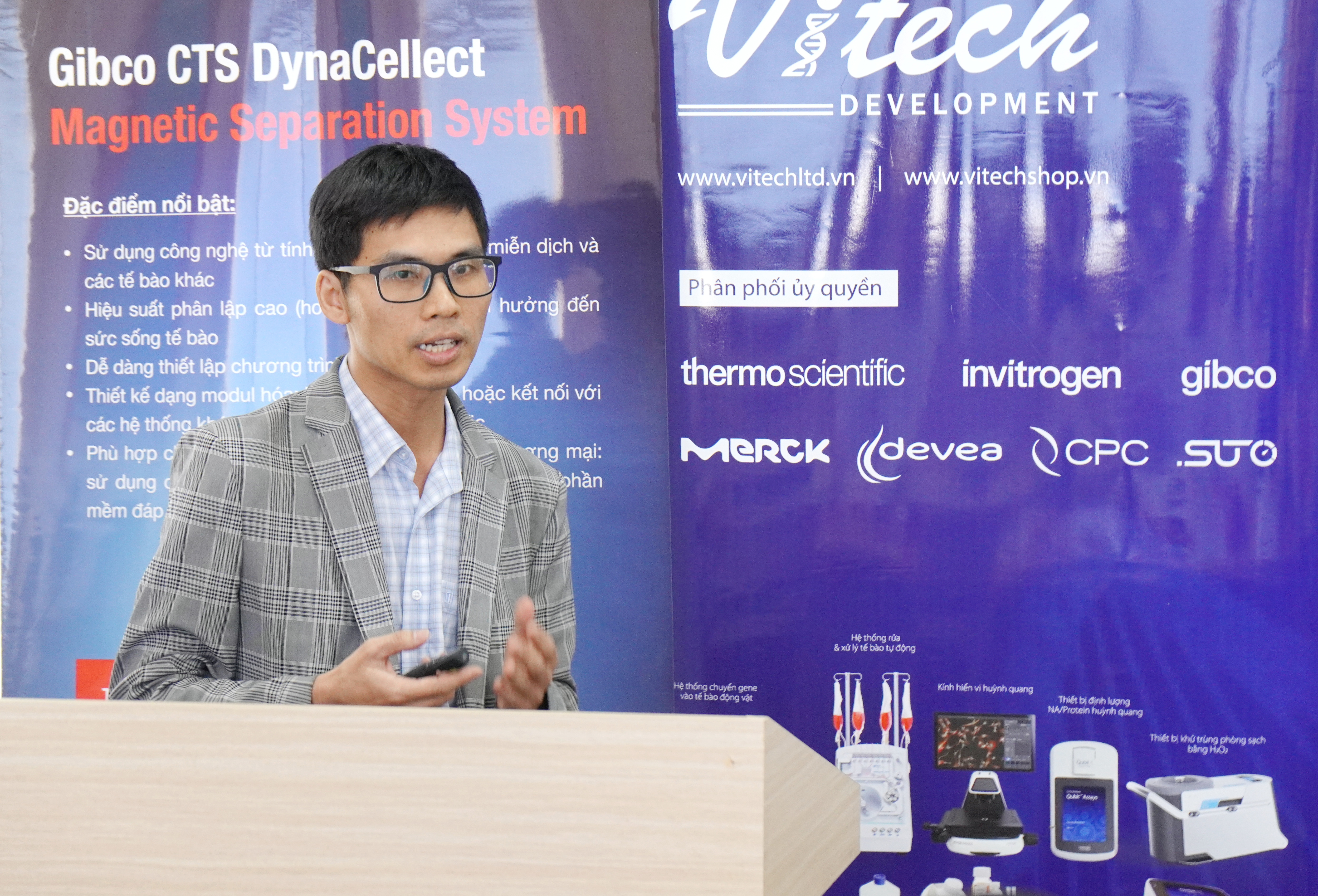 Hình 4. ThS. Phạm Trần Đăng Thức báo cáo chủ đề "Giải pháp tách tế bào và phân tích tế bào và mô hiện đại: DynaCellect™ & EVOS™ S1000"