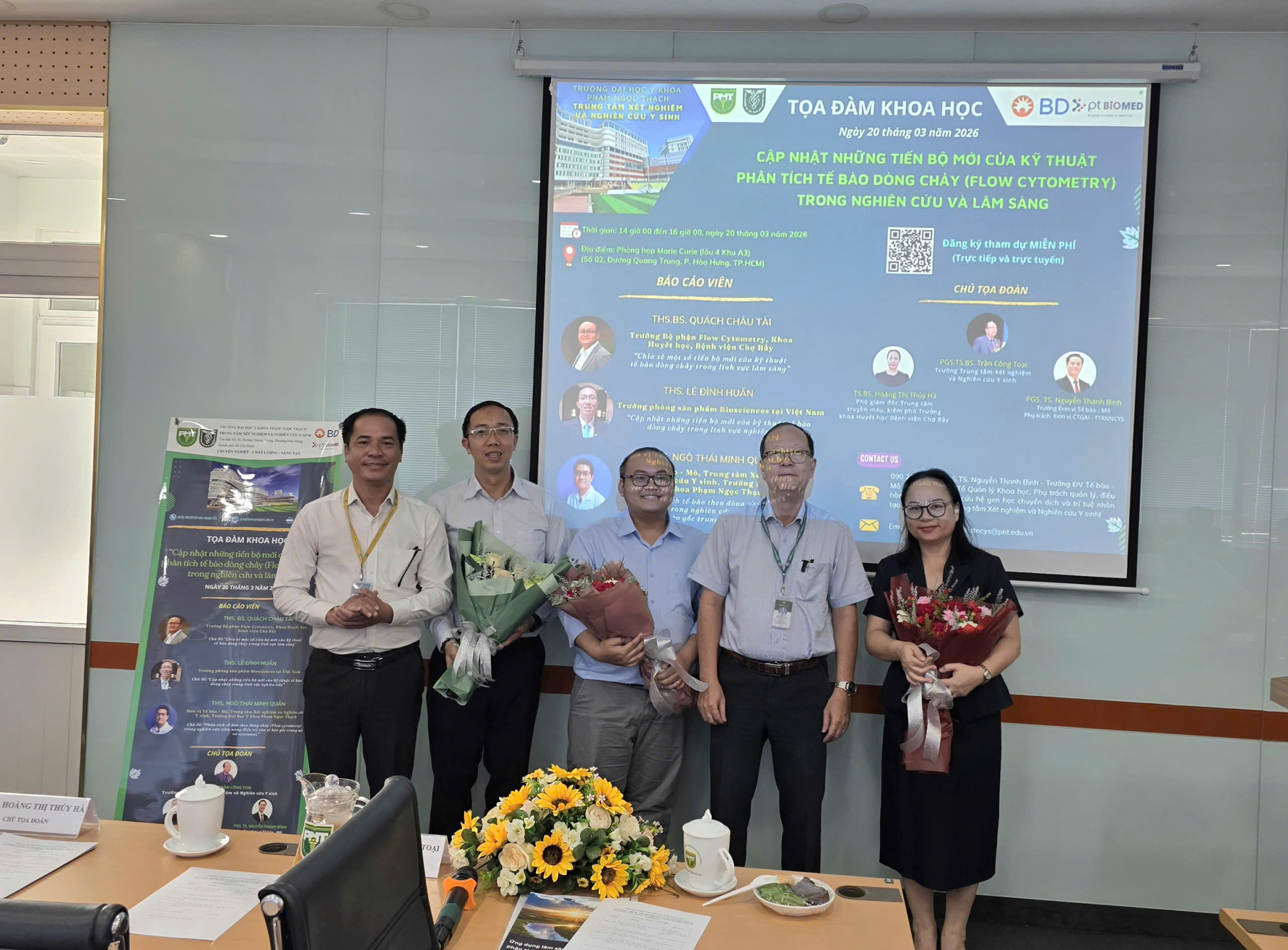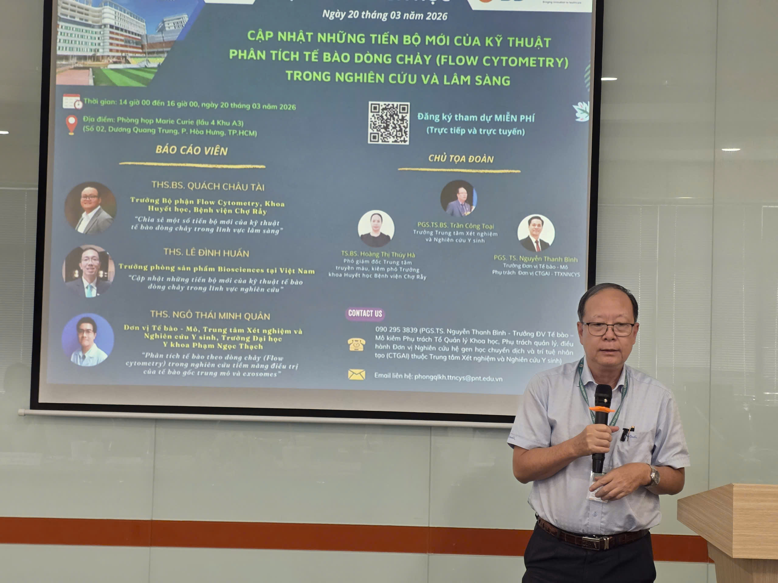 Chiều ngày 20 tháng 3 năm 2026, Trung tâm Xét nghiệm và Nghiên cứu Y sinh (TTXNNCYS) thuộc Trường Đại học Y khoa Phạm Ngọc Thạch (TĐHYKPNT) tổ chức thành công toạ đàm khoa học chủ đề “Cập nhật những tiến bộ mới của kỹ thuật phân tích tế bào dòng chảy (Flow cytometry) trong nghiên cứu và lâm sàng”
